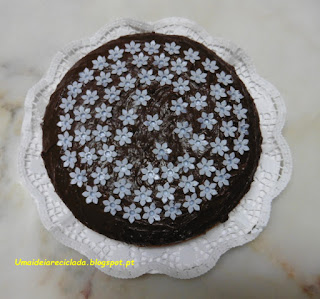 Com cobertura e recheio de chocolate, completei a decoração com as 70 bases das 70 velas.